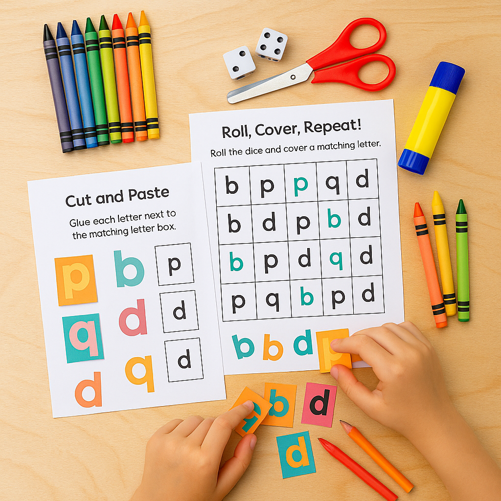• Dice activities for identifying and writing b, d, p, and q